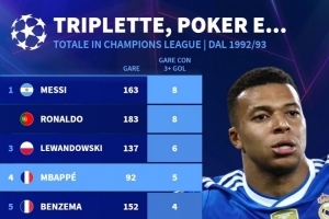 歐冠改制以來(lái)單場(chǎng)進(jìn)球3+場(chǎng)次榜: