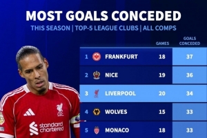 體育資訊11月27日訊 德國轉會市場統計了本賽季五大聯賽球隊的失球數量,并列出榜單,法蘭克福丟37球最多,利物浦丟34球第三。