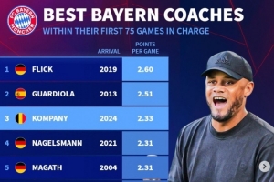 拜仁主帥執教前75場場均拿分榜: