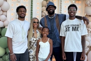湖人前鋒詹姆斯的小兒子布萊斯更新Instagram Story,曬出一張詹姆斯全家五口人的合影,并寫(xiě)道:“感恩??”