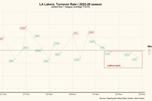 備注:虛線為聯盟平均線,綠色為贏球比賽失誤率,紅色為輸球比賽失誤率