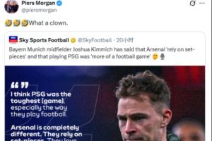 體育資訊11月28日訊 英國主持人、著名阿森納球迷皮爾斯·摩根在社交媒體炮轟基米希,直言其是“小丑”。