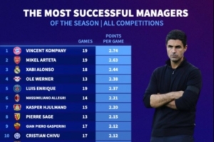 體育資訊11月28日訊 本賽季五大聯(lián)賽中,拜仁和阿森納均有著極為出色的表現(xiàn)。德國轉(zhuǎn)會(huì)市場盤點(diǎn)了五大聯(lián)賽主帥場均拿分情況,孔帕尼、阿爾特塔和阿隆索位居前三。值得一提的是,這三名主帥都是名副其實(shí)的少壯派。