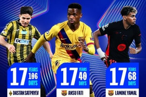 歐冠官方曬出最年輕進(jìn)球者前三海報(bào),其中法蒂以17零40天成為歐冠最年輕進(jìn)球者,其次是17歲零68天的亞馬爾,排名第三正是薩特帕耶夫。
