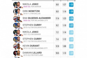 本賽季,約基奇每回合單打得1.27分,超平均水平0.33分皆是近20個賽季最高。
