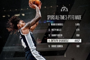 瓦塞爾迎來(lái)里程碑,他的三分命中數(shù)來(lái)到662記,超越布魯斯·鮑文升至隊(duì)史第四。