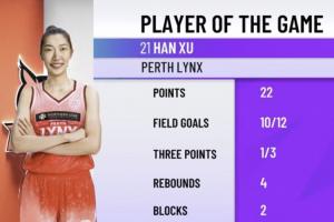 韓旭的WNBL首秀,登場29分鐘,12投10中(三分3中1),罰球2中1,拿到并列全場最高的22分,外加4板1助2帽1斷。