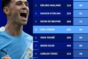 體育資訊11月30日訊 在本輪英超,曼城3-2擊敗利茲聯,福登梅開二度。以下為曼城隊史英超射手榜: