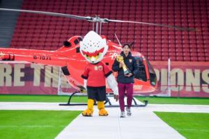 激動(dòng)人心的奪冠視頻過(guò)后,大家的目光被靜候在內(nèi)場(chǎng)的臨港捷運(yùn)紀(jì)念版直升機(jī)吸引,儀式開(kāi)始前,這架直升機(jī)載著王燊超和獎(jiǎng)杯從川沙飛抵球場(chǎng)。這一環(huán)節(jié)不僅是榮耀的展示,更是俱樂(lè)部積極探索“低空+足球”體旅融合新范式的生動(dòng)實(shí)踐。隨后,王燊超與俱樂(lè)部總經(jīng)理沙良昌共同將新賽季冠軍獎(jiǎng)杯安放于柱頂,與三座往屆火神杯組成“冠軍獎(jiǎng)杯矩陣”,將現(xiàn)場(chǎng)氛圍推向高潮。