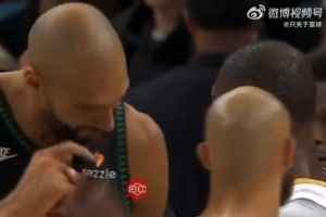 賽后發生有趣一幕,戈貝爾指著自己的腦門,對杰倫·布朗面授機宜,大致意思是別整發際線粉了,像我這樣多好。有趣的是,在這過程中另一個大光頭德里克·懷特從他倆身前走過。