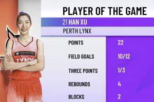 韓旭此役完成WNBL首秀,出戰28分鐘41秒,兩分9中9,三分3中1,罰球2中1,砍下并列全隊最高的22分,另外有4籃板2蓋帽。