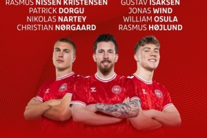 后衛:韋斯特高(萊斯特城)、安諾森(富勒姆)、克里斯滕森(巴薩)、霍斯貝里(斯特拉斯堡)、維克托-尼爾森(維羅納)、拉斯穆斯-克里斯滕森(法蘭克福)、多爾古(曼聯)