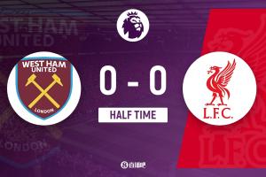 上半場補時1分鐘,西漢姆聯0-0利物浦。