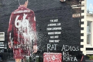 本周中的歐冠皇馬將客戰利物浦,阿諾德重返安菲爾德。賽前,阿諾德在利物浦當地的一處壁畫遭到了球迷的污損。