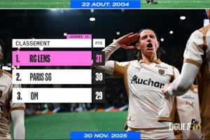 體育資訊12月1日訊 法甲第14輪,朗斯客場2-1擊敗昂熱,14輪過后10勝1平3負(fù)31分位列法甲積分榜首位。