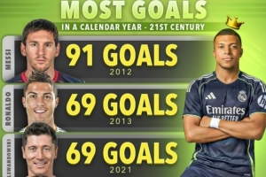 體育資訊12月1日訊 數(shù)據(jù)網(wǎng)站Score90盤(pán)點(diǎn)了21世紀(jì)以來(lái)單一自然年進(jìn)球榜,其中梅西91球高居榜首,姆巴佩今年60球第6,具體如下: