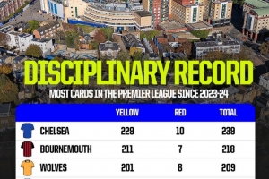 體育資訊12月1日訊 數據網站OPTA盤點了英超球隊自23/24賽季以來吃牌榜,其中切爾西229黃10紅,兩項數據均為最多,具體榜單如下: