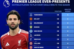 體育資訊12月1日訊 英超已經戰罷13輪,《轉會市場》統計了本賽季至今一分鐘都未缺席的全勤非門將球員,共計16人: