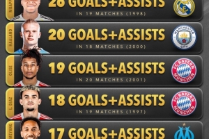 本賽季五大聯賽球員參與進球榜(所有賽事):