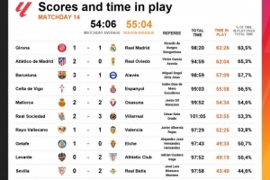 1.赫羅納1-1皇馬 98分20秒 凈時(shí)間62分26秒