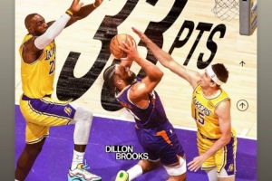 賽后,狄龍轉(zhuǎn)發(fā)了一張自己上籃的照片,而詹姆斯和里夫斯當(dāng)了背景板,還有他的得分。
