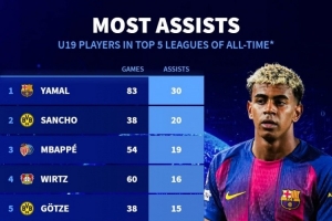 五大聯賽歷史U19球員助攻排名(19歲之前助攻):