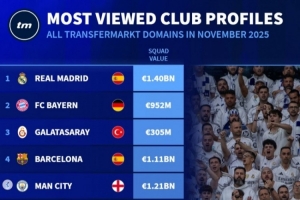 體育資訊12月3日訊 德轉列出了11月份俱樂部頁面瀏覽量排名,皇馬、拜仁、加拉塔薩雷前三。