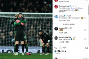 曼城門將多納魯馬社媒曬出與哈蘭德擁抱的照片,配文:“你早就告訴過我英超很瘋狂,是吧!??”