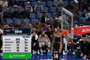 轉(zhuǎn)播方給出了一組新秀數(shù)據(jù),首輪13號(hào)秀奎因本賽季總得分(第五)、籃板(第二)、助攻(第一)、搶斷(第三)和蓋帽(第三)皆在2025屆新秀前五。