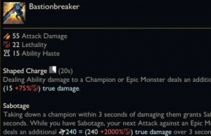 你過去三秒內(nèi)傷害過的敵方英雄死亡會為你提供一個破壞效果,你對史詩級野怪或者防御塔的下一次攻擊會消耗掉這個效果,造成基于穿甲的額外持續(xù)傷害