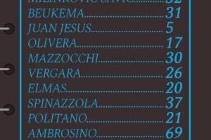 那不勒斯首發(fā):32-瓦尼亞·米林科維奇;31-別克馬、5-胡安·熱蘇斯、17-奧利維拉;30-馬佐基、26-維爾加拉、20-埃爾馬斯、37-斯皮納佐拉;21-波利塔諾、69-安布羅西諾、27-盧卡
