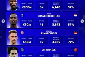 維蒂尼亞(巴黎,25歲,葡萄牙):身價9000萬歐,68場,5373分鐘,勝率78%
