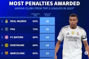 2025年五大聯賽俱樂部各項賽事獲得點球榜及命中率: