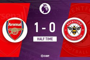 上半場補時3分鐘,阿森納1-0布倫特福德。