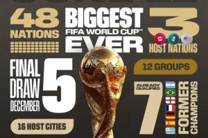 2026世界杯抽簽將于12月06日星期六01:00進行,為預熱抽簽儀式,世界杯官推曬海報盤點本屆世界杯的數據: