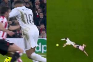 西甲第19輪,皇馬3-0客勝畢爾巴鄂競技,姆巴佩2射1傳。其中第一球,姆巴佩接到阿諾德的長傳,卸球轉(zhuǎn)身擺脫左后衛(wèi)萊奎、帶球推進(jìn)、弧頂變向過掉中衛(wèi)拉波爾特、射門得分,這個(gè)過程一氣呵成,萊奎防守姆巴佩時(shí)上手拉、下腳鏟都沒攔住!