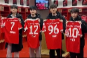 體育資訊12月4日訊 T1分享動態:選手們在拜仁主場手持球衣合照。