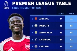 體育資訊12月5日訊 《轉會市場》統計了2025年英超總積分情況,阿森納多賽1場力壓曼城居首。