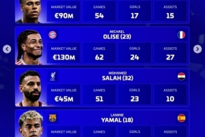 奧利塞(拜仁,23歲,法國(guó)):身價(jià)1.3億歐,62場(chǎng),24球,27助攻