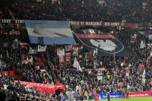 在死忠看臺,一眾曼聯球迷打出大幅tifo表達對利馬的支持,將阿根廷國旗里的太陽替換為了菜刀…