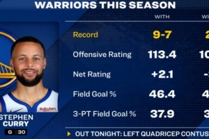 轉播方給出一組數據,本賽季庫里在場時勇士9勝7負,進攻效率113.4,凈效率+2.1,投籃命中率46.4%,三分命中率37.9%;