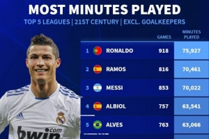 體育資訊12月5日訊 德國轉會市場統計了21世紀非門將球員在五大聯賽的出場時間,并列出榜單,C羅居首,拉莫斯、梅西二三位。