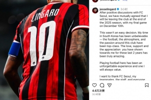 體育資訊12月5日訊 今日,首爾FC官方宣布林加德將在賽季結(jié)束后離隊(duì),隨后林加德也在社媒發(fā)文,告別首爾FC。
