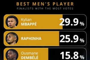 體育資訊12月6日訊 環球足球獎官方曬出了2025年最佳球員的投票情況,姆巴佩29.9%領跑。