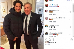 帕托社媒曬出與現任巴西主帥安切洛蒂的合照,并@安切洛蒂,帕托效力米蘭期間曾在安切洛蒂麾下踢球。
