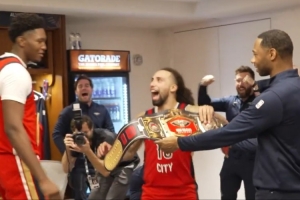 賽后,鵜鶘眾將在更衣室開心慶祝,阿爾瓦拉多接過(guò)主帥威利·格林遞過(guò)來(lái)的金腰帶,將其頒給了奎因。