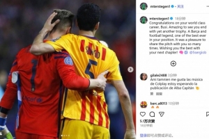 特爾施特根寫道:布斯克茨,祝賀你擁有世界級的職業生涯。看到你以又一座獎杯結束職業生涯,真是令人驚嘆!你是巴薩和足壇傳奇,也是有史以來最出色的中場之一。與你多次并肩作戰是我的榮幸,祝你在人生的下一個篇章中一切順利!
