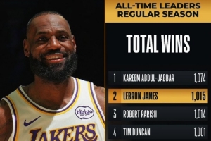 據NBA官方統計,這是詹姆斯生涯第1015場常規賽勝利,超越“酋長”帕里什,升至NBA歷史第二位,僅次于“天勾”賈巴爾的1074場。
