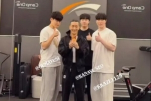 體育資訊12月8日訊 健身三人組??健身教練分享與Gumayusi、Kanavi、Zeka合照。