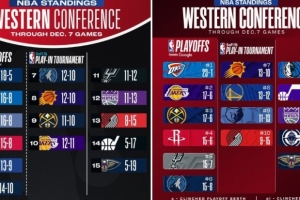 去年今天,聯盟排名如上圖,當時獨行俠西部第二,勇士第五,快船第六,湖人12勝11負第十。